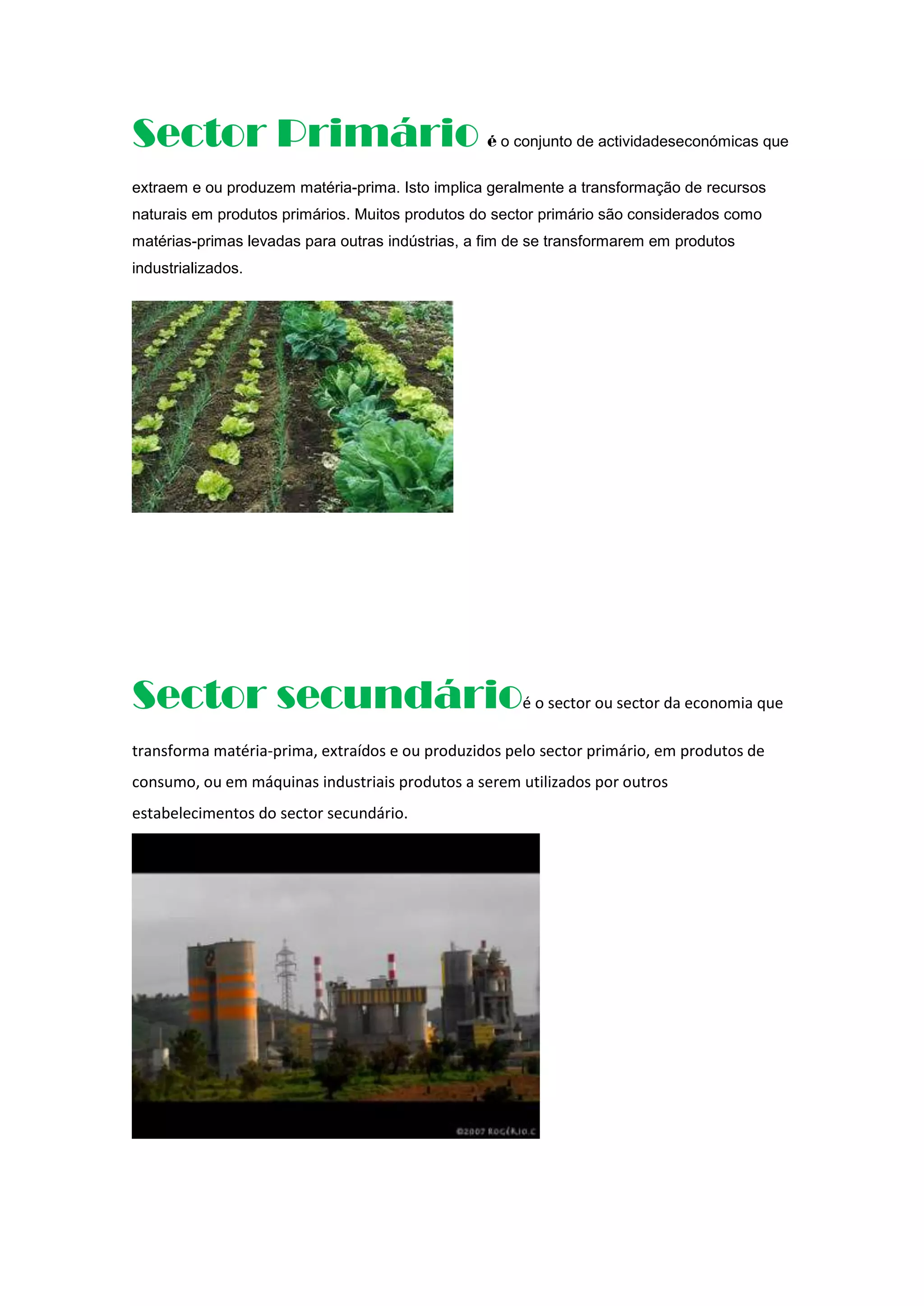 O documento descreve os quatro setores da economia: o setor primário extrai e produz matérias-primas; o setor secundário transforma matérias-primas em produtos; o setor terciário engloba serviços; e o setor quaternário envolve atividades baseadas no conhecimento como tecnologia e educação.