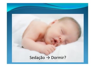 O documento discute técnicas de sedação para terapia intensiva, incluindo objetivos como intubação orotraqueal e ventilação mecânica. Ele lista classes farmacológicas comuns como hipnóticos, benzodiazepínicos e opióides, além de vias de administração e monitorização. Também aborda situações especiais como intubação acordado e sequência rápida de intubação para evitar broncoaspiração.