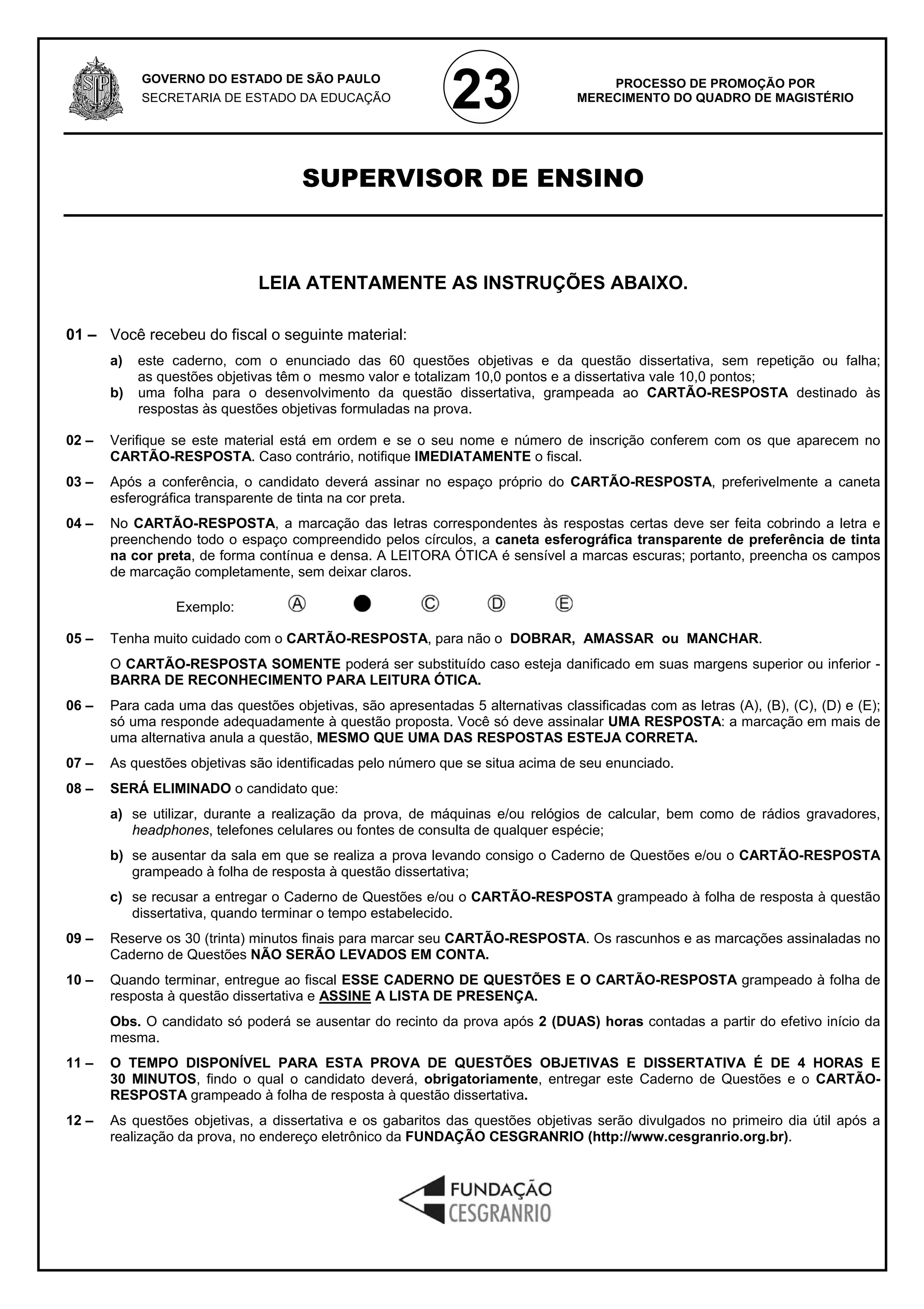 Este documento fornece instruções sobre os procedimentos e regras para a realização de uma prova de promoção por merecimento para o quadro de magistério de supervisor de ensino. Ele explica que o candidato receberá um caderno de questões e um cartão de respostas e fornece detalhes sobre como preencher o cartão, o tempo disponível para a prova e as consequências de não seguir as regras.