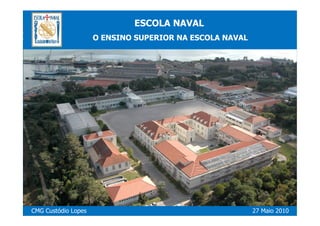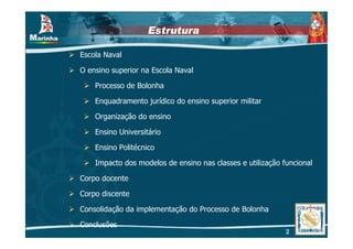 O documento descreve o ensino superior na Escola Naval, incluindo: 1) a implementação do Processo de Bolonha com a adoção de um sistema de três ciclos de estudos e créditos ECTS; 2) a organização do ensino universitário e politécnico; 3) o impacto nos modelos de ensino e classes de oficiais.