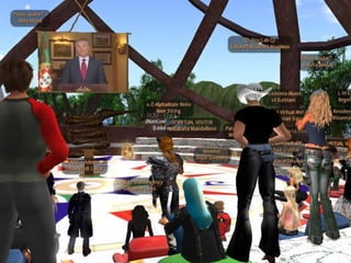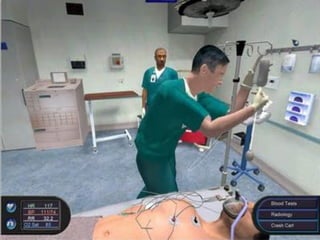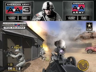 Este documento discute o uso de ambientes virtuais imersivos para treinamento militar. Apresenta exemplos de jogos e simulações usados para treinamento tático e apoio psicológico a veteranos, e discute os desafios de validade e custos desse tipo de treinamento.