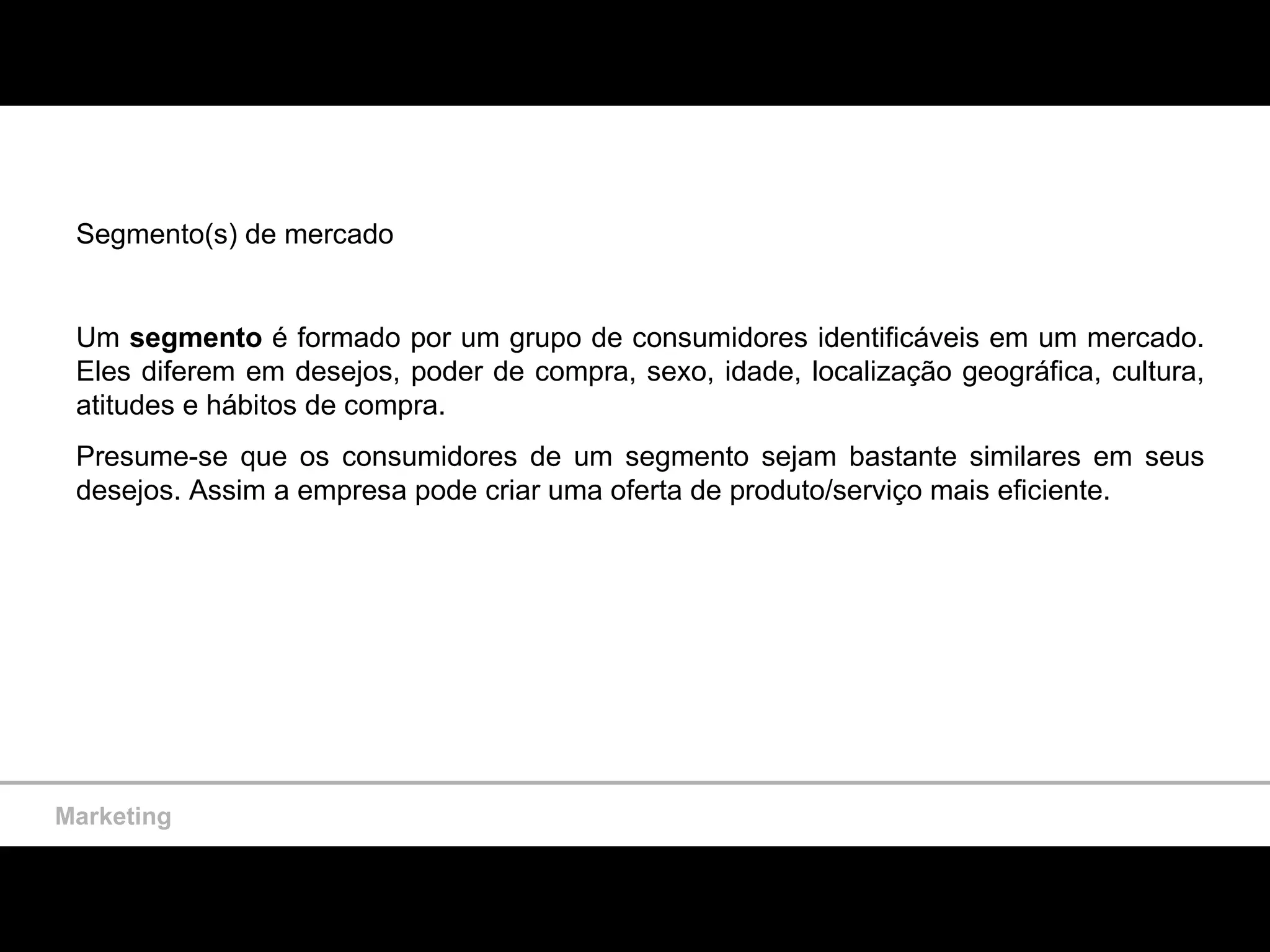 Um segmento de mercado é formado por um grupo de consumidores com características similares. As empresas podem segmentar o mercado por geografia, demografia ou psicografia para criar ofertas personalizadas. A Dell, por exemplo, oferece computadores customizados de acordo com as necessidades individuais de cada cliente.