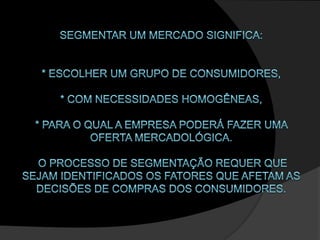 Segmentar um mercado significa dividir consumidores em grupos com necessidades semelhantes para os quais a empresa pode criar ofertas específicas. Uma empresa deve escolher seu mercado-alvo considerando a capacidade de atender necessidades dos consumidores, seu poder aquisitivo e condições de compra. Existem diferentes níveis de segmentação como marketing de massa, segmento, nicho, local e individual.
