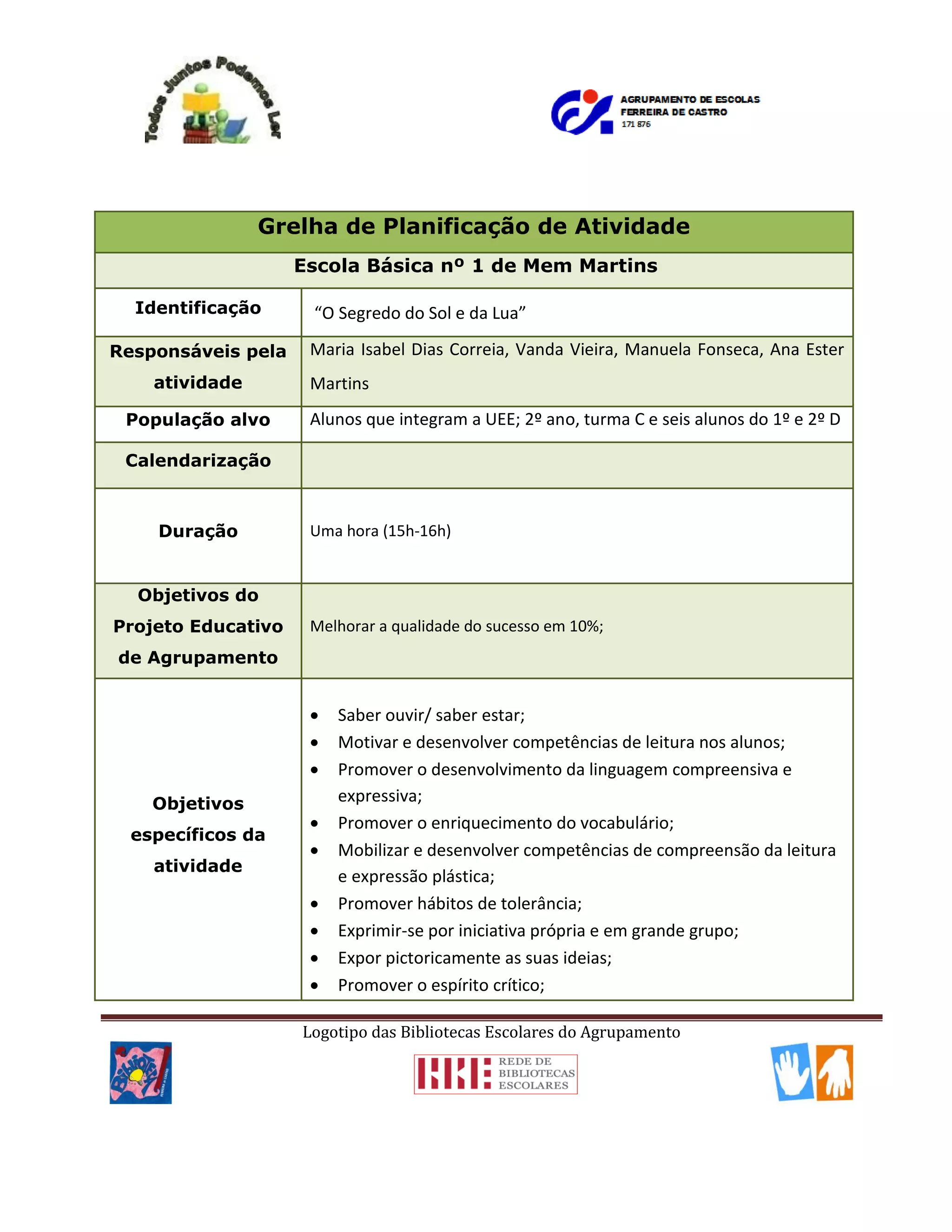 Este documento descreve uma atividade planejada na biblioteca escolar com o objetivo de melhorar as competências de leitura e expressão dos alunos do 2o ano através da exploração do livro "O Segredo do Sol e da Lua". A atividade inclui a leitura do livro, interpretação através de fichas de trabalho e pintura, e tem como produtos um PowerPoint e desenhos dos alunos.