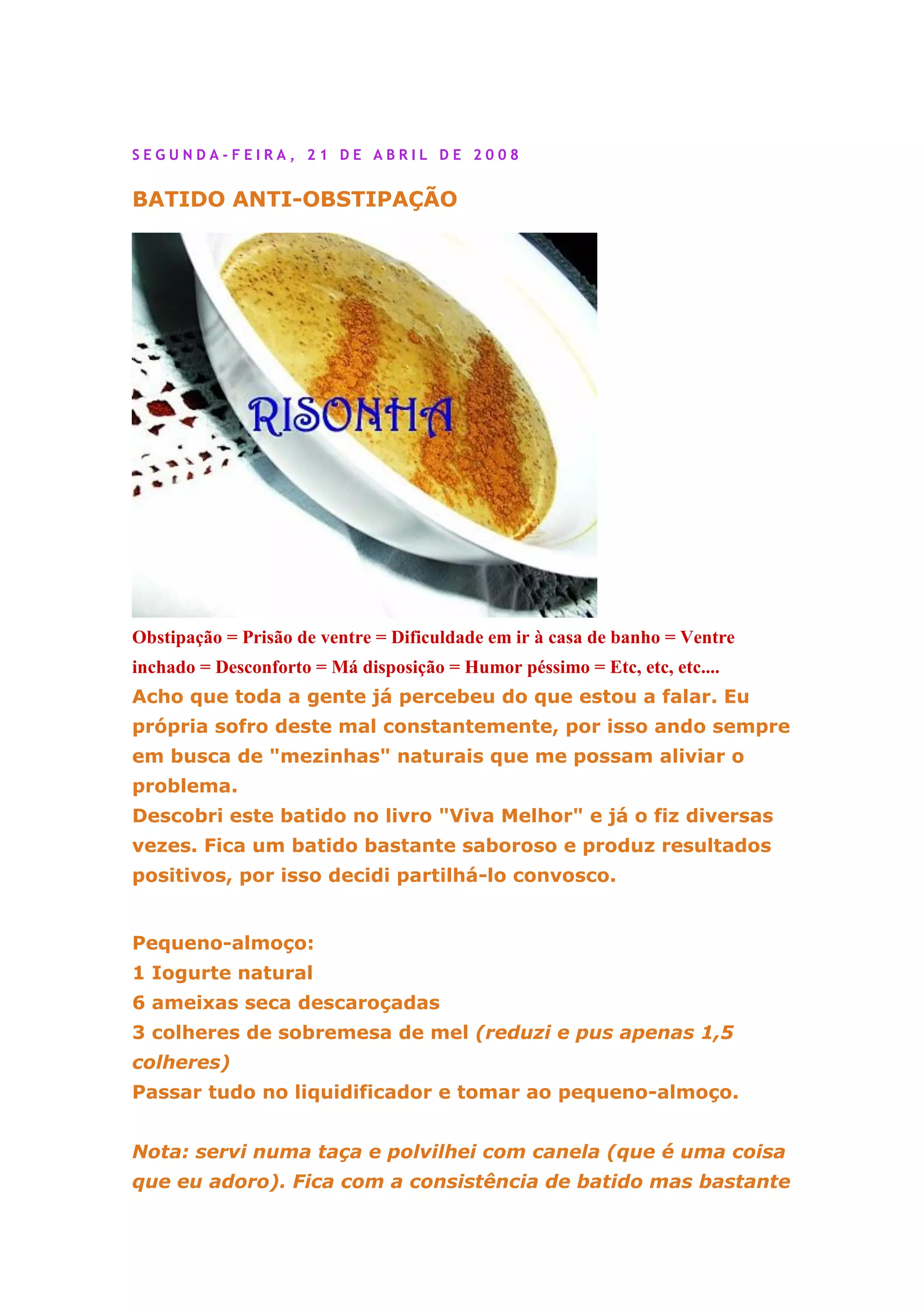 O documento descreve uma receita de um batido caseiro para aliviar a obstipação. A receita inclui iogurte natural, ameixas secas, mel e, opcionalmente, leite para dar uma consistência mais líquida. A autora compartilha esta receita natural que produz resultados positivos para o seu problema de prisão de ventre.