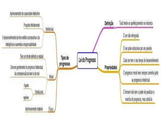 O documento discute a evolução das leis humanas e espirituais ao longo do progresso da humanidade. Aponta que as leis humanas mudam conforme a sociedade evolui, enquanto as leis naturais são imutáveis. Também descreve como o movimento por direitos civis nos EUA levou à mudança nas leis de segregação racial. Finalmente, discute como o Espiritismo contribui para o progresso moral do ser humano.