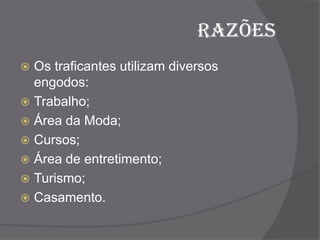 Este documento discute vários tópicos relacionados aos direitos das mulheres ao longo da história, incluindo a violência contra as mulheres, assédio sexual, e tráfico humano. Aborda como a sexualidade feminina foi silenciada e como as crianças e mulheres sofreram abusos e exploração. Também fornece estatísticas sobre esses problemas e discute legislação e projetos para proteger os direitos das mulheres.