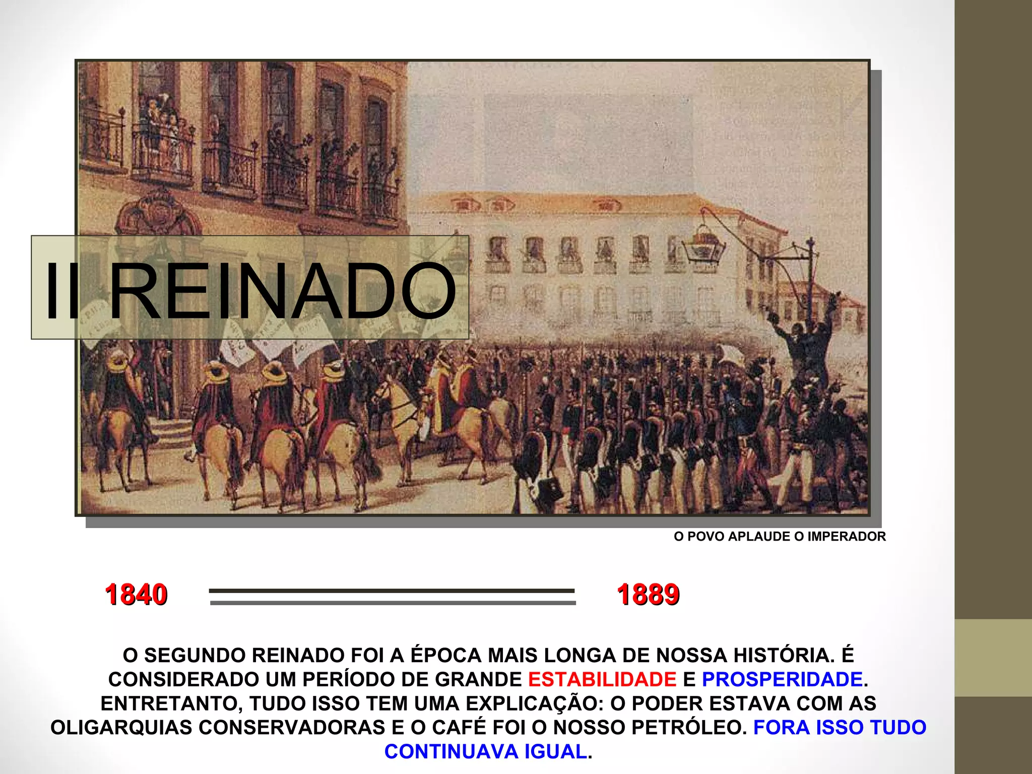O documento descreve os principais acontecimentos políticos, econômicos e sociais do Brasil durante o Segundo Reinado (1840-1889), período de estabilidade e prosperidade devido ao café, mas também de manutenção do poder pelas oligarquias conservadoras. A abolição da escravatura em 1888 enfraqueceu o Império, levando à proclamação da República em 15 de novembro de 1889, através de um golpe militar apoiado pela burguesia paulista.