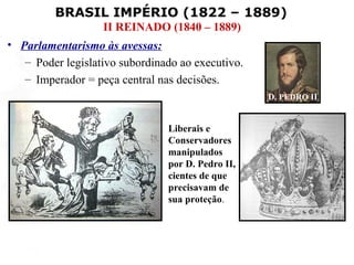 O documento resume o período do Império Brasileiro sob o II Reinado (1840-1889), caracterizado por:
