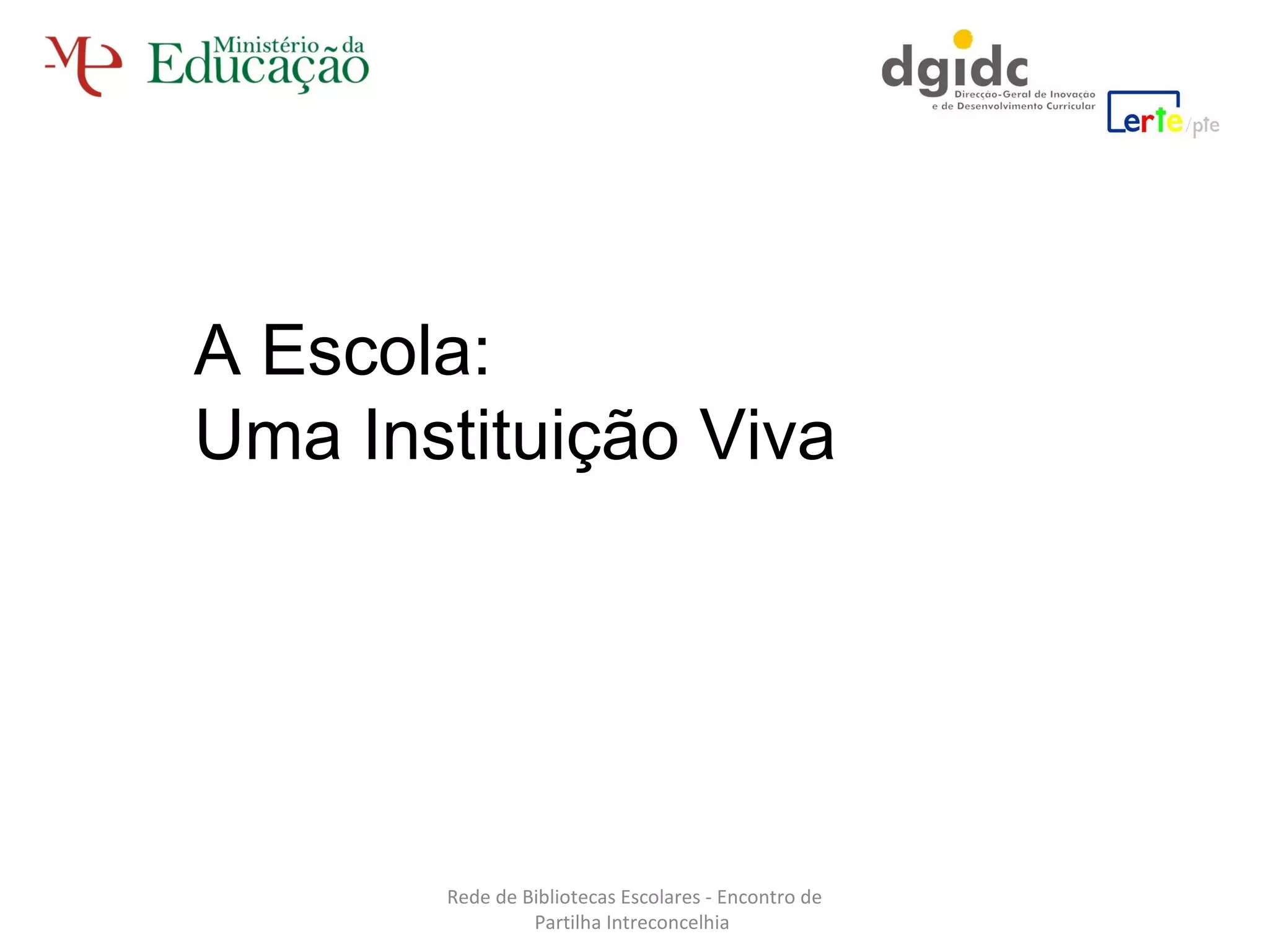 O documento discute a evolução das bibliotecas escolares em relação à tecnologia e à educação contemporânea, destacando a importância da integração de recursos online no aprendizado. Ele menciona iniciativas como a formação de formadores e a necessidade de novas competências para professores em um ambiente digital. Além disso, enfatiza a responsabilidade das escolas em promover segurança na internet e formas modernas de ensino e aprendizagem.
