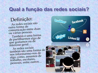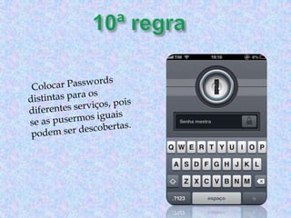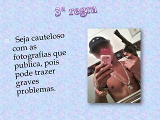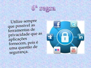 Este documento fornece informações sobre segurança em redes sociais. Ele lista 10 regras para manter a privacidade e segurança online, como manter perfis privados, não compartilhar dados pessoais publicamente, verificar as contas dos filhos com frequência e ter cuidado ao aceitar pedidos de amizade de desconhecidos.