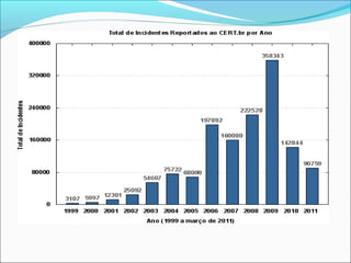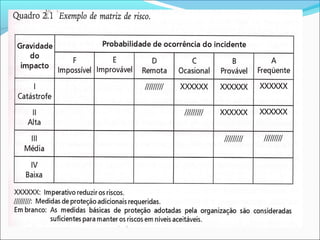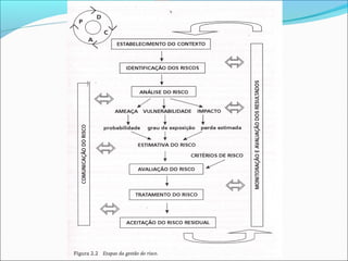 O documento discute a importância da segurança da informação para proteger os dados das empresas contra problemas como roubo, vírus e crimes. Ele fornece recursos sobre práticas recomendadas de segurança e gestão de riscos, incluindo a análise e avaliação dos riscos para identificar vulnerabilidades e implementar controles adequados.