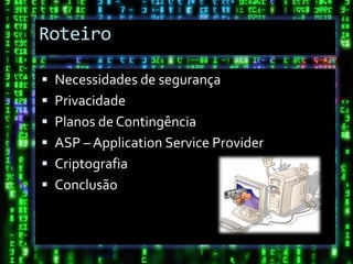 O documento discute a segurança da informação e privacidade na era digital. Aborda conceitos como segurança da informação, segurança nacional, comércio eletrônico e privacidade. Também discute ameaças como cookies, web bugs, spywares e formas de proteger dados pessoais.