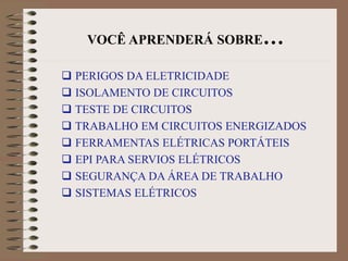 O documento discute práticas de segurança para trabalhos elétricos, incluindo desenergização e teste de circuitos, uso de EPI, ferramentas isoladas e procedimentos para trabalhar perto de circuitos energizados. É necessário treinamento especializado e apenas pessoal autorizado deve realizar serviços elétricos. A segurança deve ser a principal prioridade em qualquer trabalho envolvendo eletricidade.