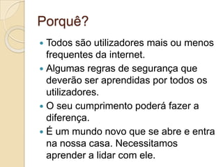 O documento discute a segurança na internet, ressaltando que todos os usuários devem aprender regras essenciais para se protegerem online. Aborda as vantagens e desvantagens da internet, como acesso à informação e riscos associados a vírus e interações sociais. Também apresenta recomendações de segurança, como a proteção de senhas e a precaução em relacionamentos online.