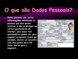 Este documento discute a importância de proteger dados pessoais online, definindo o que são dados pessoais e exemplos dos mesmos. Também explica o papel da CNPD em proteger dados pessoais e situações em que a divulgação é obrigatória, opcional ou simplesmente opcional. Aconselha os leitores a terem cuidado ao fornecer dados online e nas redes sociais.