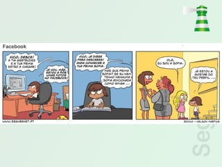 A banda desenhada trata da segurança na internet e fornece conselhos para navegar de forma segura, como não fornecer dados pessoais a estranhos e tomar cuidado com links e anexos de e-mails desconhecidos.