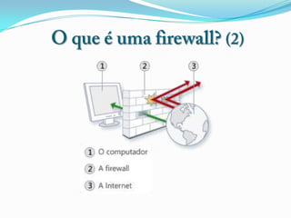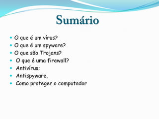 O documento discute vários tipos de ameaças de segurança cibernética como vírus, spyware, Trojans e como proteger um computador contra elas. Define vírus, spyware e Trojans e explica o que é uma firewall, antivírus e antispyware. Recomenda usar esses programas e uma firewall para proteger o computador de hackers e softwares maliciosos.