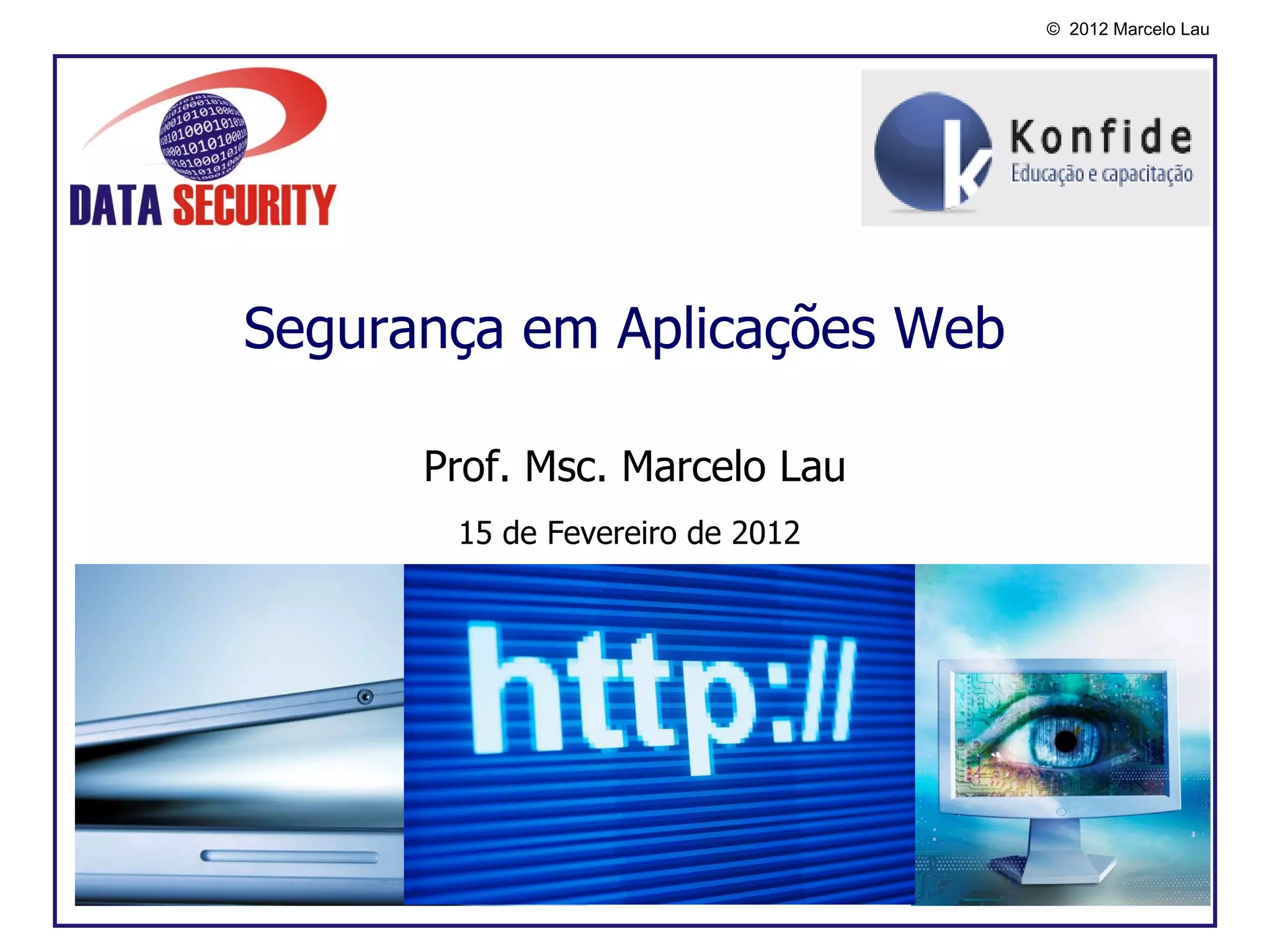 O documento discute segurança em aplicações web. Em 3 frases, resume que páginas na web são frequentemente adulteradas, sistemas possuem muitas fragilidades descobertas, e que os principais riscos estão nos usuários, aplicativos e infraestrutura.