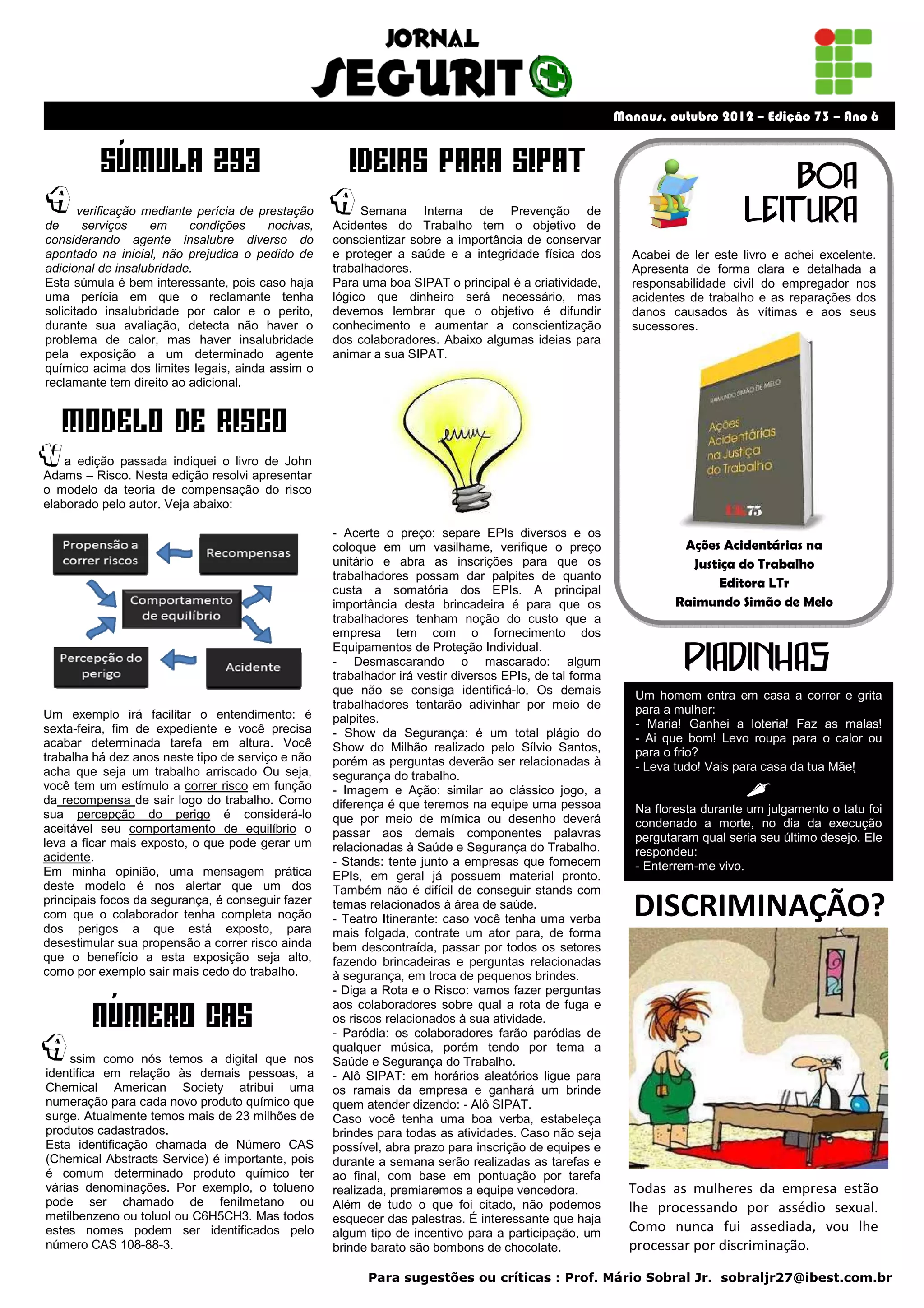 O documento fornece ideias para atividades em uma Semana Interna de Prevenção de Acidentes do Trabalho (SIPAT), como brincadeiras e jogos relacionados à segurança e saúde ocupacional. Também discute benefícios previdenciários como auxílio-doença e auxílio-acidente, e a obrigação patronal de prevenir acidentes de acordo com a legislação.