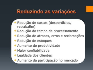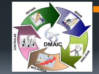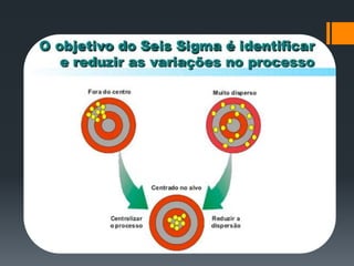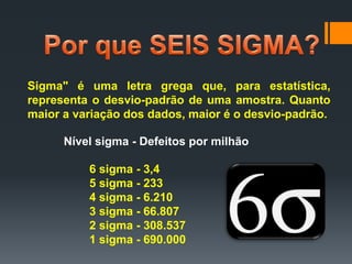 O documento discute o método Seis Sigma, incluindo sua história, conceitos e aplicações. Ele explica que o Seis Sigma começou na Motorola em 1987 e visa reduzir defeitos e variabilidade em processos. Também descreve as principais ferramentas do Seis Sigma como DMAIC e DMADV e como ele é usado em diversas indústrias como saúde, bancos e construção.
