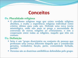 O documento discute os conceitos e características do pluralismo religioso, seitas e espiritismo. O pluralismo religioso defende que não existe uma verdade religiosa absoluta e que todas as religiões devem cooperar. Seitas são grupos com crenças diferentes da crença considerada genuína. O espiritismo acredita na comunicação com espíritos e na reencarnação. Há diferentes tipos de espiritismo como o kardecismo, que acredita na mediunidade.