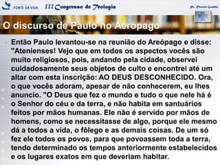 O documento discute o discurso de Paulo no Areópago em Atenas, apresentando trechos da passagem bíblica. Também aborda temas como panoramas religiosos no Brasil, crescimento evangélico, curiosidades sobre religiões e migração religiosa.