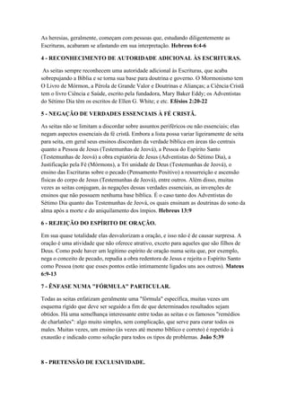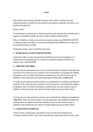 O documento discute o que são seitas e como identificá-las. Ele lista 8 formas de identificar seitas: 1) semelhança com o cristianismo, 2) adeptos sinceros mas sem entendimento, 3) reivindicam novas revelações, 4) reconhecem autoridade além da Bíblia, 5) negam verdades essenciais, 6) rejeitam a oração, 7) enfatizam "fórmulas", 8) se consideram a única expressão válida do cristianismo.