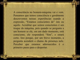 O documento discute a consciência e como ela oscila entre diferentes estados, desde o sono até estados mais elevados. Argumenta-se que precisamos aprender a trazer os estados mais elevados de consciência para a nossa vida diária através da auto-observação e lembrança de si, um processo que envolve dividir a atenção em diferentes níveis como o 'Eu' Observador e o Mordomo. A meta final é despertar o nosso ser consciente divino.