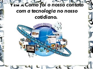 O documento discute como a tecnologia tem sido usada no cotidiano escolar. Ele explora se os professores estão preparados para usar estratégias educacionais como as Tecnologias de Informação e Comunicação e como as mídias são apropriadas na escola. Também discute como os computadores podem ser usados como ferramentas educacionais e como a informática tem sido usada para ensinar diversos assuntos.