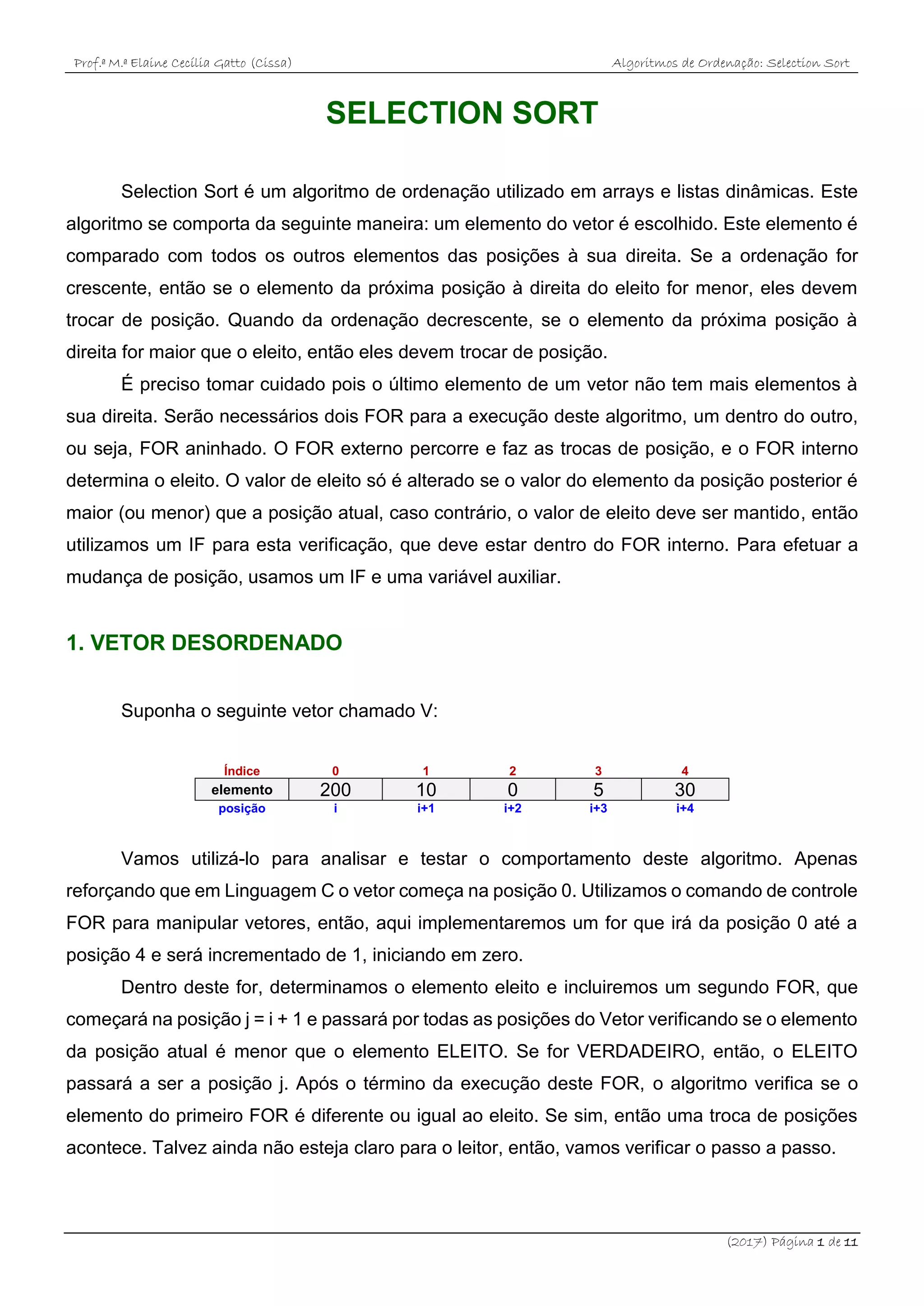 O documento descreve o algoritmo de ordenação Selection Sort, explicando seu funcionamento passo a passo em um vetor de exemplo. Primeiro, um elemento é escolhido como "eleito" e comparado com os demais elementos à direita. Se um for menor/maior, depende da ordenação, ele se torna o novo "eleito". Após as comparações, os elementos na posição inicial e do "eleito" podem ser trocados.