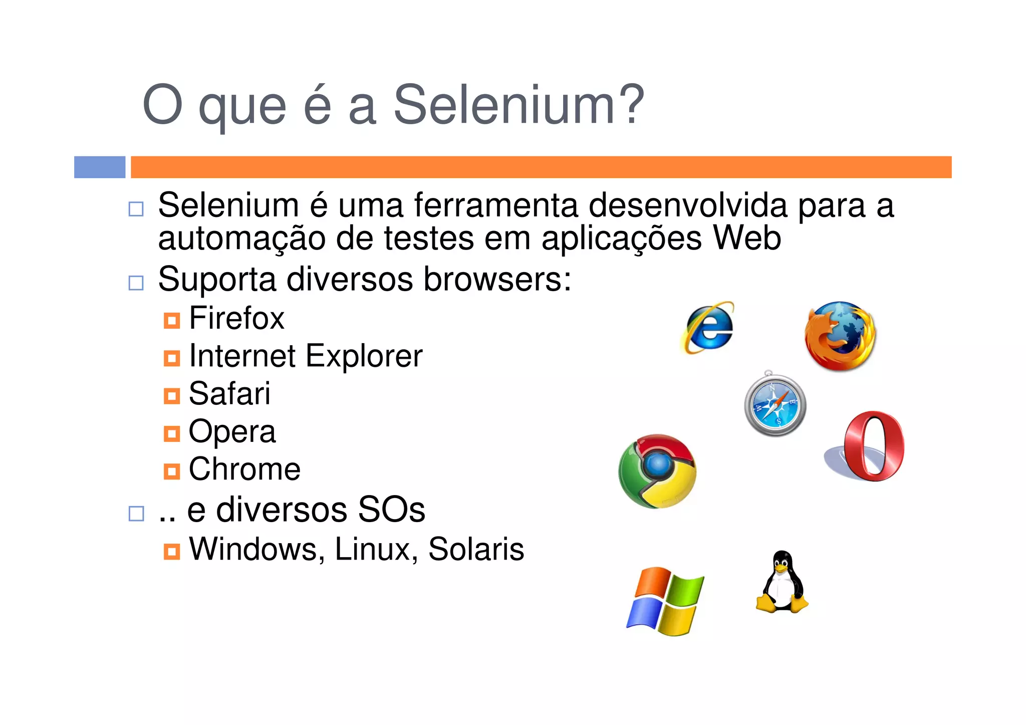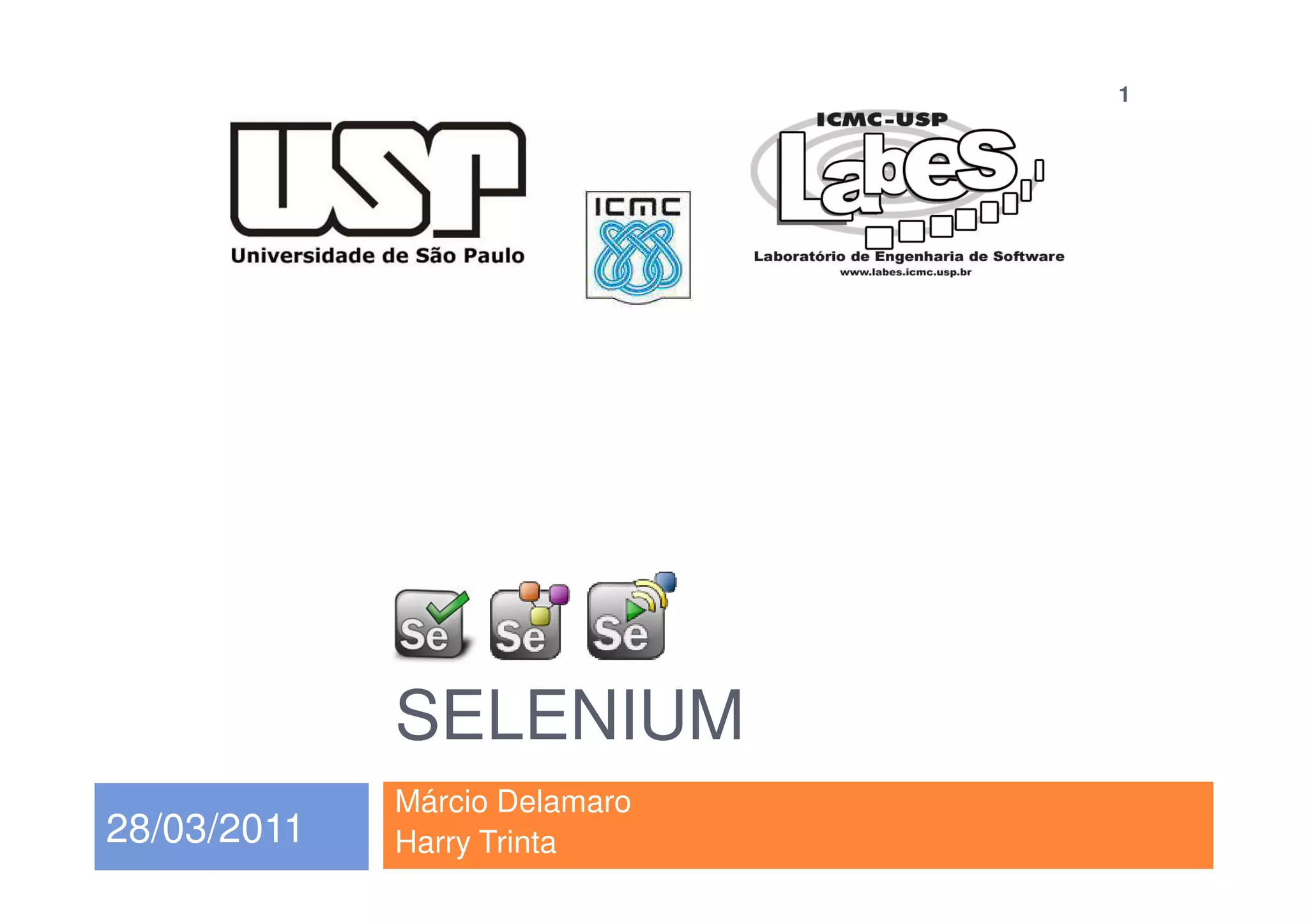 O documento descreve o que é Selenium, uma ferramenta para automação de testes em aplicações web. Selenium permite testar diversos navegadores e sistemas operacionais e pode realizar testes funcionais, de regressão e de desempenho. Possui três principais componentes: Selenium IDE para gravação de testes, Selenium RC que executa os testes e Selenium Grid para executar testes em paralelo.