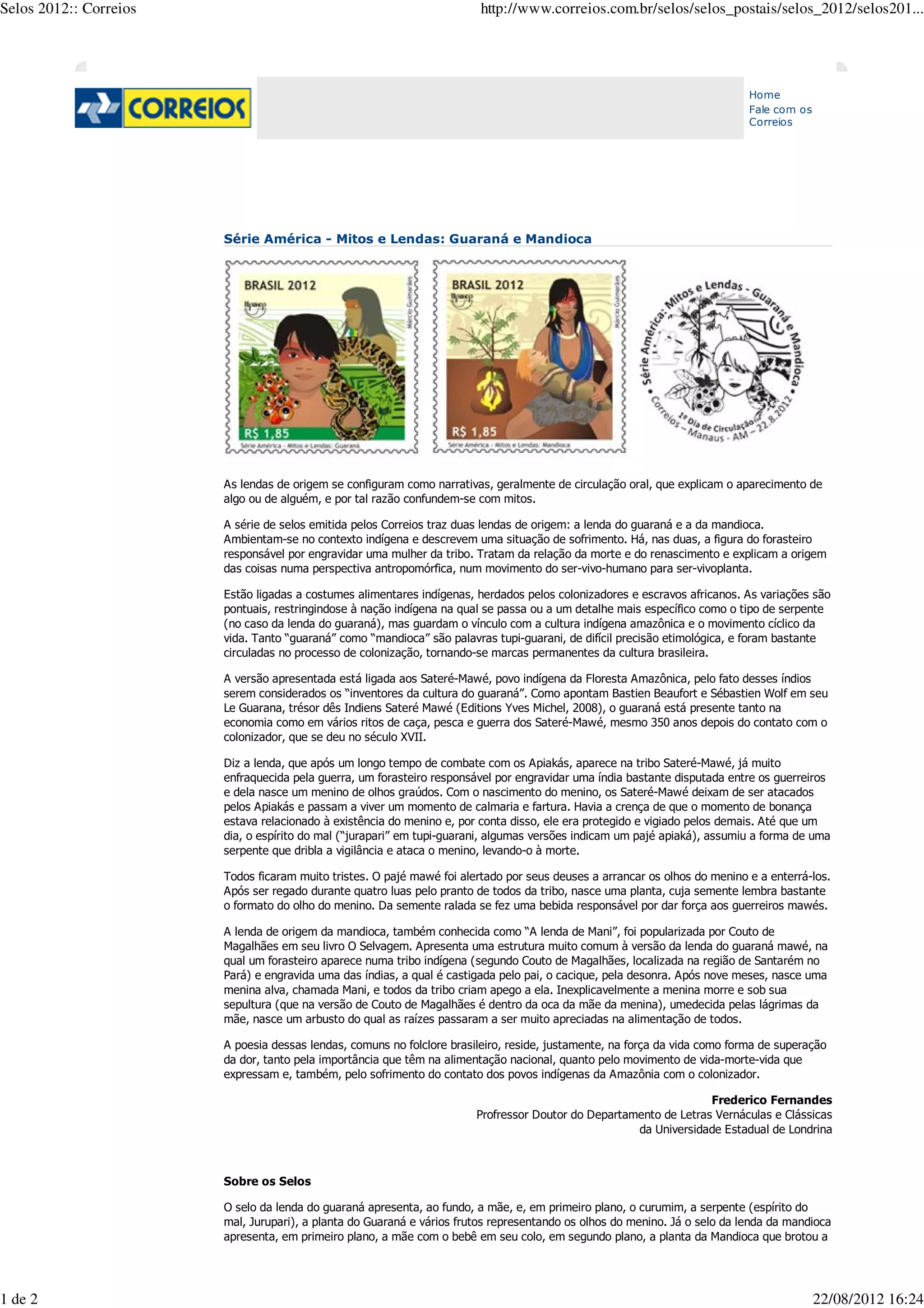 O documento descreve duas lendas indígenas sobre a origem do guaraná e da mandioca. Ambas as lendas envolvem um forasteiro que engravidou uma mulher da tribo, resultando no nascimento de uma criança que acaba morrendo. Após a morte, nascem as plantas sagradas desses povos originários.