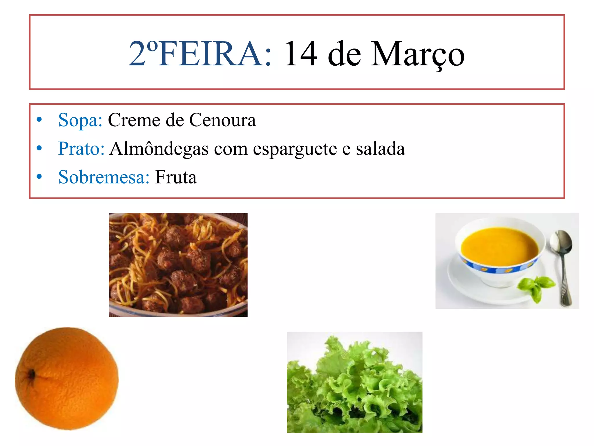 3ª Feira: 15de MarçoSopa:Caldo VerdePrato: Peixe Cozido com legumesSobremesa:Fruta