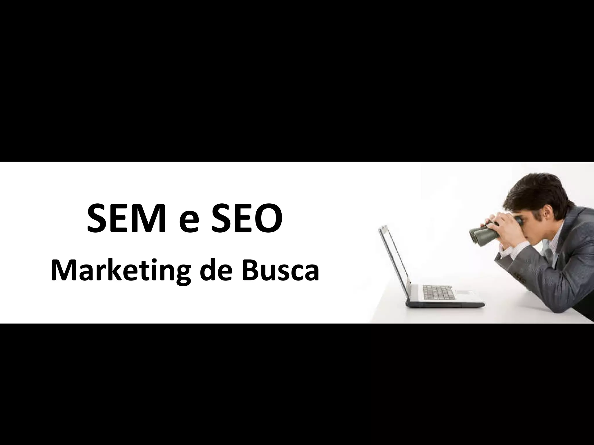 O documento discute estratégias de marketing de busca (SEM) e otimização para mecanismos de busca (SEO). Explica como os buscadores funcionam e a importância de aparecer nas primeiras páginas dos resultados. Também apresenta ferramentas do Google para análise de palavras-chave e monitoramento de tráfego, além de sites com mais informações sobre o tema.