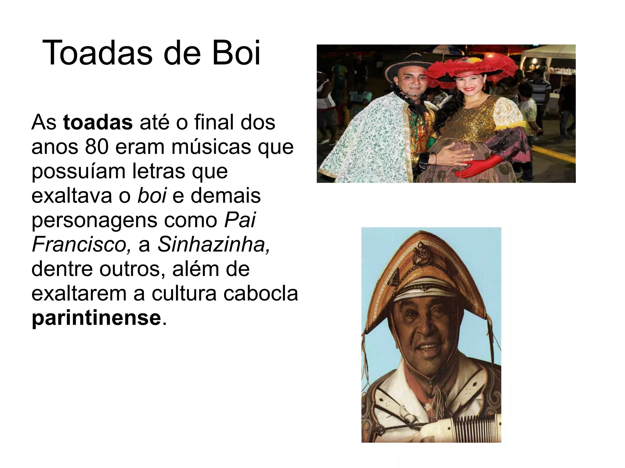 As toadas de boi até os anos 80 exaltavam o boi e personagens da cultura cabocla parintinense. Na década de 90, a temática indígena foi introduzida com sucesso no Boi Bumbá de Parintins. As toadas refletem o passado do Nordeste e a cultura do vaqueiro, mostrando temas valiosos e sofrimentos através da música.