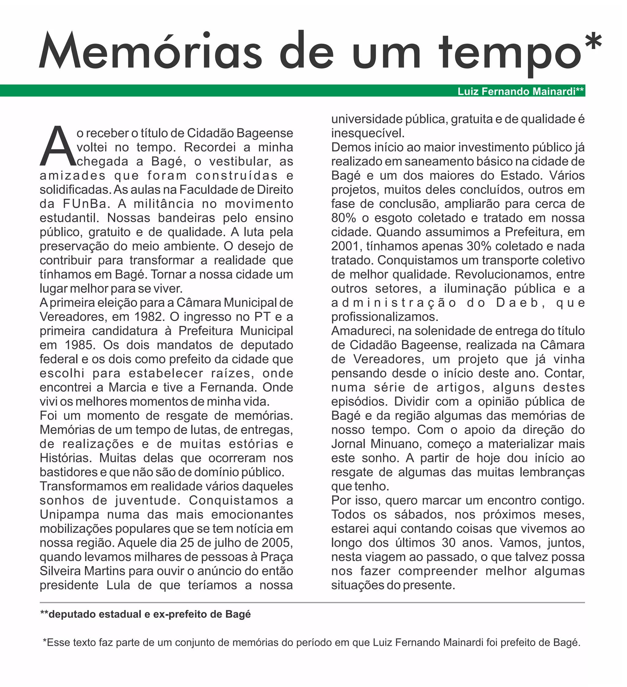 o receber otítulo de Cidadão Bageense Avoltei no tempo. Recordei a minha chegada a Bagé, o vestibular, as amizades que foram construídas e solidificadas.As aulas na Faculdade de Direito da FUnBa. A militância no movimento estudantil. Nossas bandeiras pelo ensino público, gratuito e de qualidade. A luta pela preservação do meio ambiente. O desejo de contribuir para transformar a realidade que tínhamos em Bagé. Tornar a nossa cidade um lugar melhor para se viver. Aprimeira eleição para a Câmara Municipal de Vereadores, em 1982. O ingresso no PT e a primeira candidatura à Prefeitura Municipal em 1985. Os dois mandatos de deputado federal e os dois como prefeito da cidade que escolhi para estabelecer raízes, onde encontrei a Marcia e tive a Fernanda. Onde vivi os melhores momentos de minha vida. Foi um momento de resgate de memórias. Memórias de um tempo de lutas, de entregas, de realizações e de muitas estórias e Histórias. Muitas delas que ocorreram nos bastidores e que não são de domínio público. Transformamos em realidade vários daqueles sonhos de juventude. Conquistamos a Unipampa numa das mais emocionantes mobilizações populares que se tem notícia em nossa região. Aquele dia 25 de julho de 2005, quando levamos milhares de pessoas à Praça Silveira Martins para ouvir o anúncio do então presidente Lula de que teríamos a nossa universidade pública, gratuita e de qualidade é inesquecível. Demos início ao maior investimento público já realizado em saneamento básico na cidade de Bagé e um dos maiores do Estado. Vários projetos, muitos deles concluídos, outros em fase de conclusão, ampliarão para cerca de 80% o esgoto coletado e tratado em nossa cidade. Quando assumimos a Prefeitura, em 2001, tínhamos apenas 30% coletado e nada tratado. Conquistamos um transporte coletivo de melhor qualidade. Revolucionamos, entre outros setores, a iluminação pública e a a d m i n i s t r a ç ã o d o D a e b , q u e profissionalizamos. Amadureci, na solenidade de entrega do título de Cidadão Bageense, realizada na Câmara de Vereadores, um projeto que já vinha pensando desde o início deste ano. Contar, numa série de artigos, alguns destes episódios. Dividir com a opinião pública de Bagé e da região algumas das memórias de nosso tempo. Com o apoio da direção do Jornal Minuano, começo a materializar mais este sonho. A partir de hoje dou início ao resgate de algumas das muitas lembranças que tenho. Por isso, quero marcar um encontro contigo. Todos os sábados, nos próximos meses, estarei aqui contando coisas que vivemos ao longo dos últimos 30 anos. Vamos, juntos, nesta viagem ao passado, o que talvez possa nos fazer compreender melhor algumas situações do presente. Memórias de um tempo* Luiz Fernando Mainardi** **deputado estadual e ex-prefeito de Bagé *Esse texto faz parte de um conjunto de memórias do período em que Luiz Fernando Mainardi foi prefeito de Bagé.