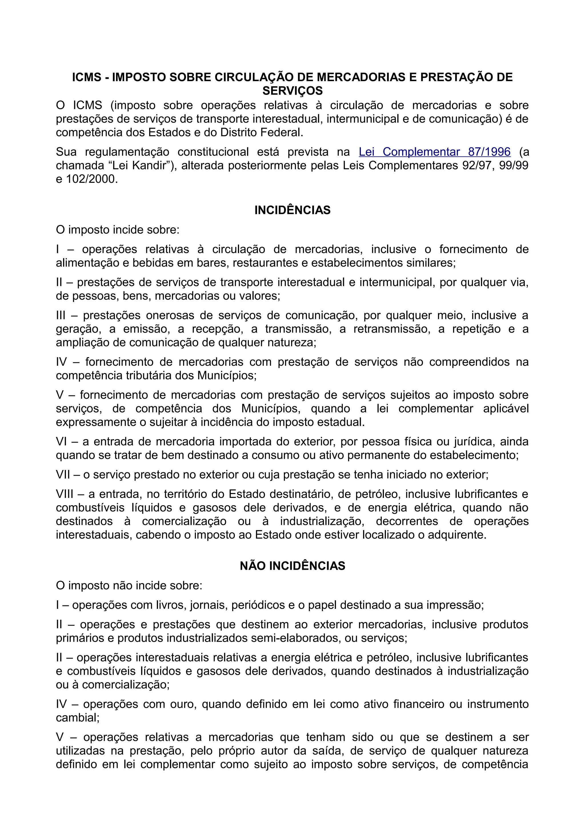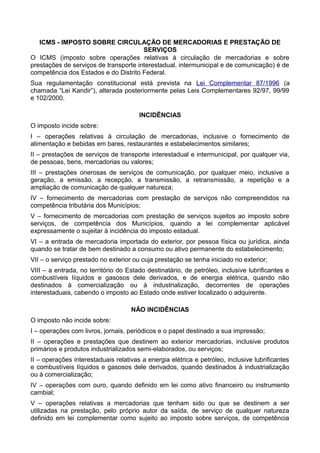 O documento descreve o ICMS, um imposto estadual sobre circulação de mercadorias e serviços. Incide sobre operações com mercadorias e certos serviços interestaduais e intermunicipais. Contribuintes são pessoas físicas e jurídicas que realizam tais operações com habitualidade ou volume significativo. O local da operação determina a incidência do imposto.