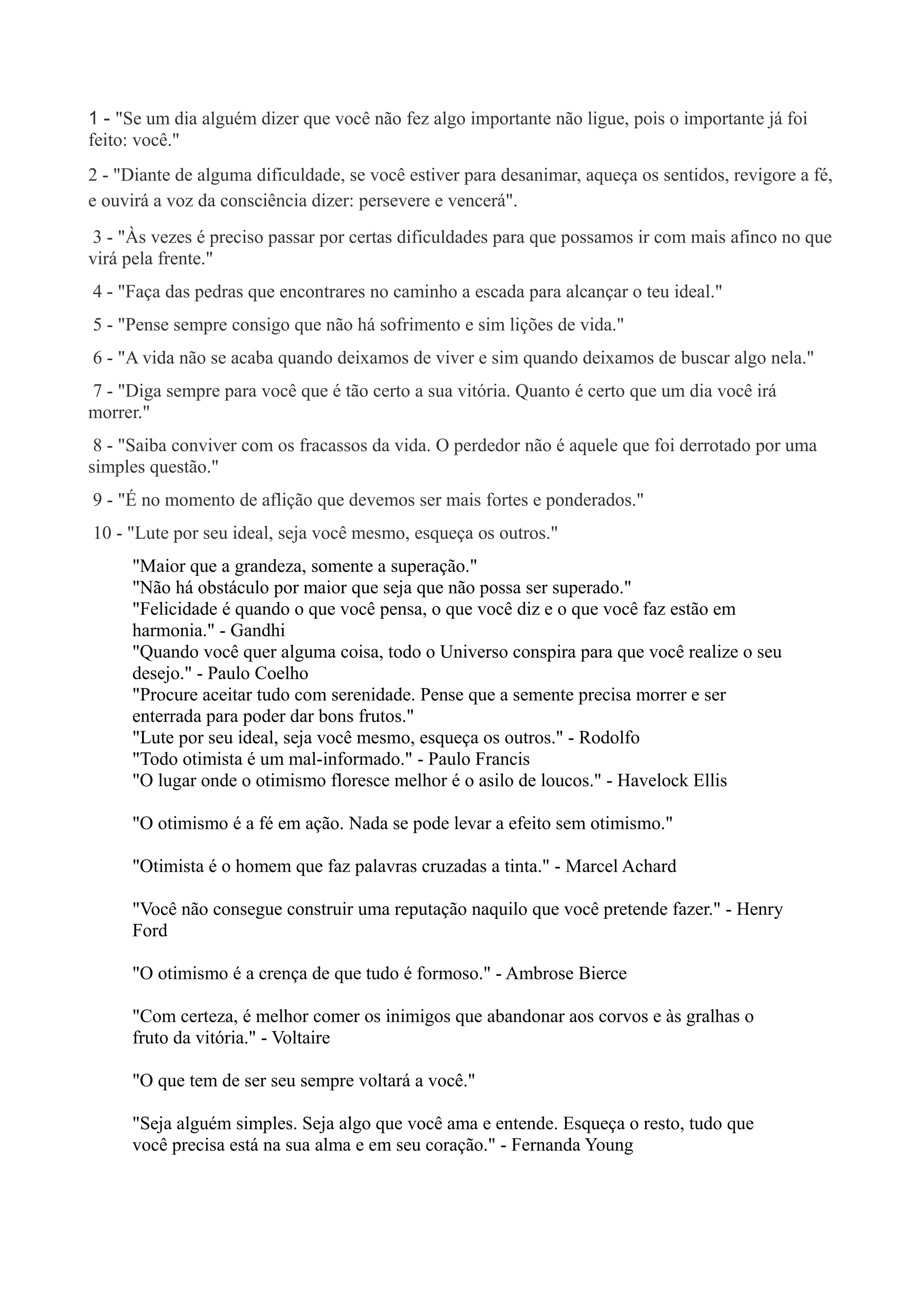 1. O documento contém várias frases motivacionais sobre perseverança, superação de dificuldades e busca pelo ideal. Ele encoraja o leitor a seguir em frente apesar dos obstáculos e fracassos, e a ser fiel aos seus princípios.