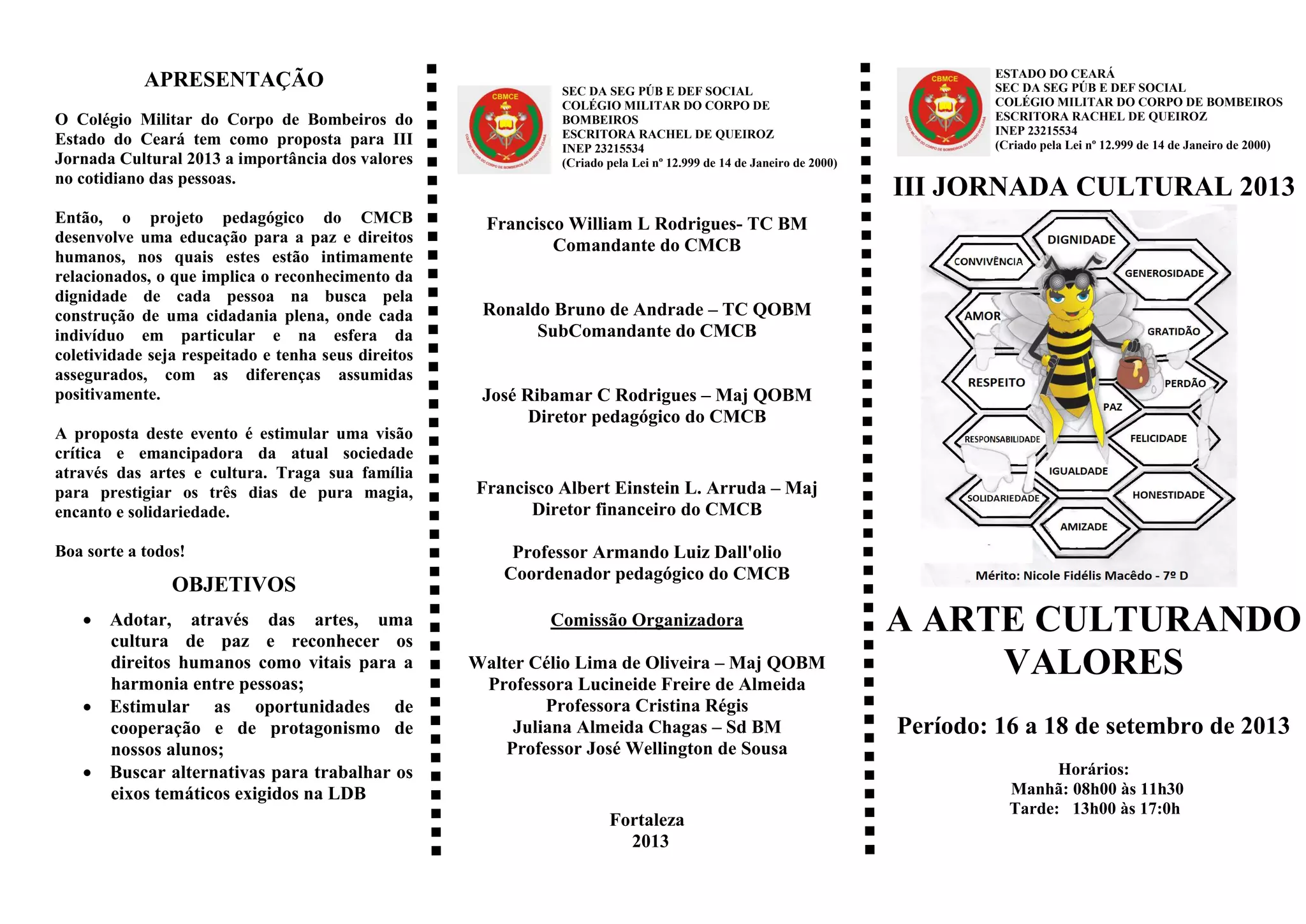 O documento descreve a programação da III Jornada Cultural do Colégio Militar do Corpo de Bombeiros do Estado do Ceará, que ocorrerá de 16 a 18 de setembro de 2013 com o objetivo de promover valores como a paz e os direitos humanos através de atividades artísticas e culturais como apresentações, gincanas e desfiles.