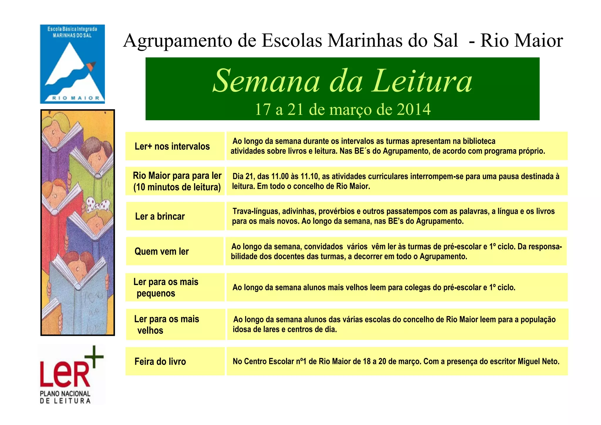 A Semana da Leitura promove várias atividades relacionadas com a leitura nas escolas do Agrupamento de Escolas Marinhas do Sal - Rio Maior entre 17 e 21 de março de 2014, incluindo apresentações na biblioteca durante os intervalos, 10 minutos de leitura em todas as escolas do concelho de Rio Maior no dia 21, passatempos com palavras para os mais novos, convidados a ler às turmas mais novas, alunos mais velhos a ler para os mais novos, alunos a ler para idosos em lares, e uma fe