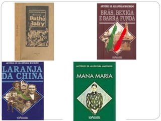 O documento descreve os principais artistas e obras do Modernismo brasileiro, incluindo Mário de Andrade, Oswald de Andrade, Manuel Bandeira e suas obras Macunaíma, Pau-Brasil e A Cinza das Horas, respectivamente. Também menciona as revistas e manifestos modernistas como Klaxon, Pau-Brasil e Antropofagia.