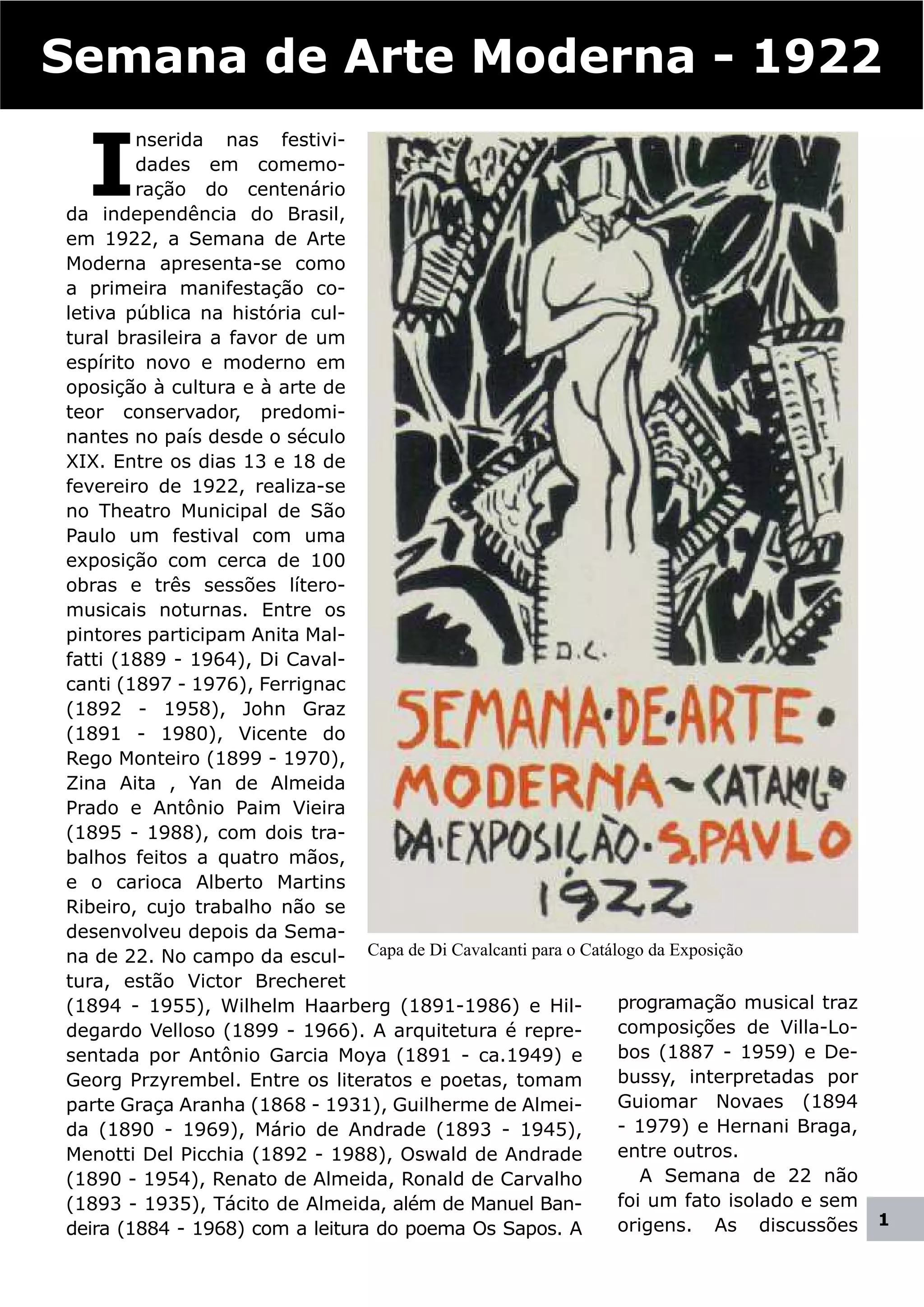 A Semana de Arte Moderna de 1922 em São Paulo marcou a primeira manifestação coletiva pública no Brasil a favor de uma arte e cultura modernas, em oposição aos ideais conservadores da época. O evento apresentou obras de pintores, escultores, arquitetos e literatos emergentes e rejeitou a arte acadêmica em busca de maior liberdade de expressão e temáticas atuais. A Semana provocou debates sobre a necessidade de uma arte brasileira moderna e influenciada por movimentos europeus, mas com raízes na cultura n