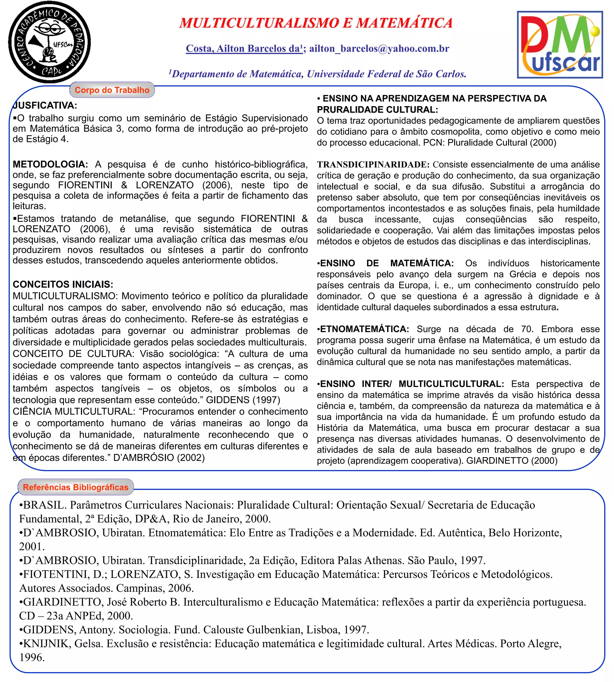 Este documento discute a importância de se ensinar matemática de uma perspectiva multicultural e interdisciplinar. Aborda conceitos como etnomatemática, pluralidade cultural e transdisciplinaridade, defendendo que o ensino deve reconhecer as contribuições de diferentes culturas e contextos ao longo da história.