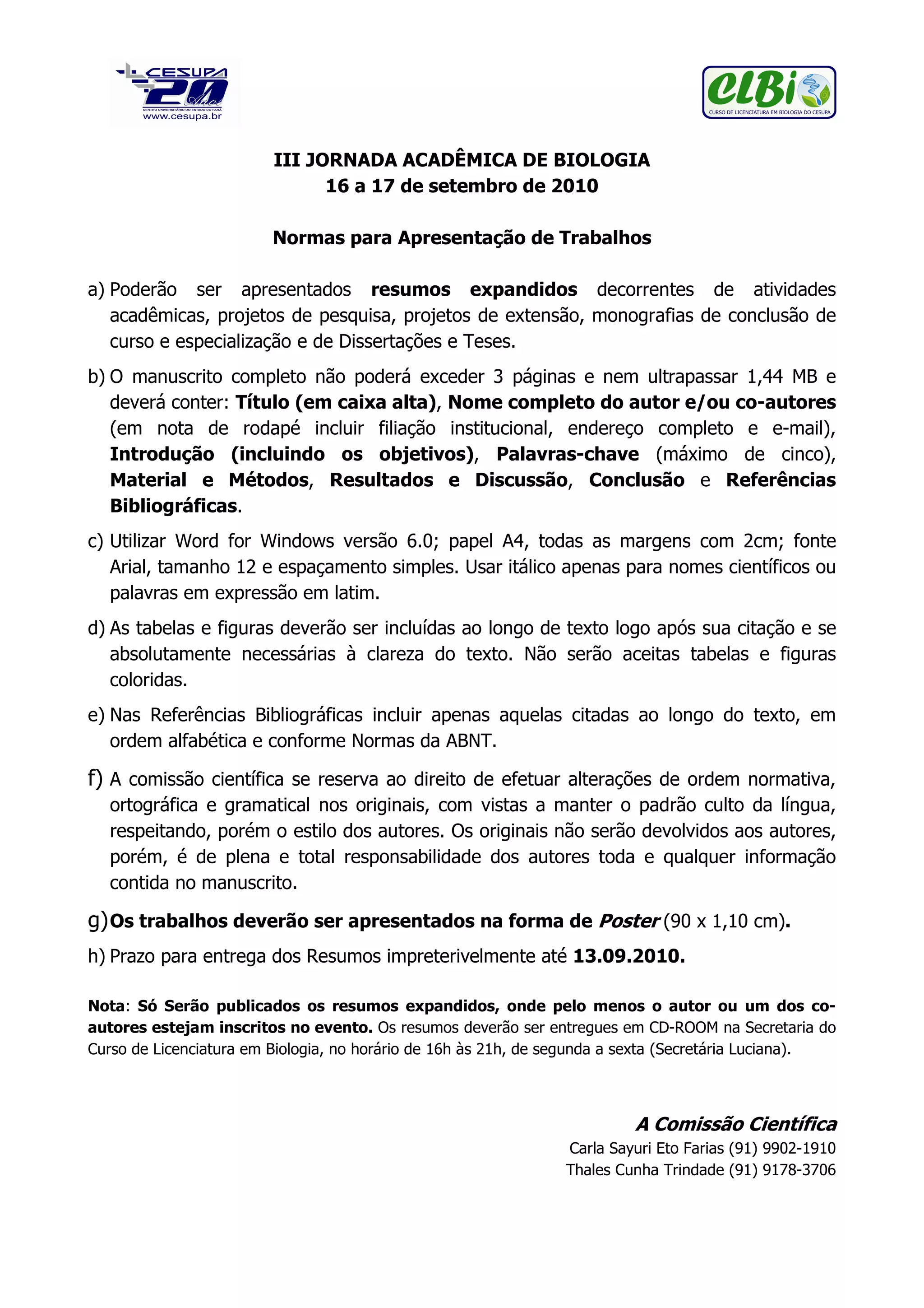 Normas para apresentação de trabalhos acadêmicos na III Jornada Acadêmica de Biologia, incluindo requisitos para resumos expandidos com até 3 páginas seguindo padrões de formatação. Prazo para envio de resumos até 13 de setembro de 2010. A comissão científica fará alterações nos originais visando padronização e os autores são responsáveis pelas informações.