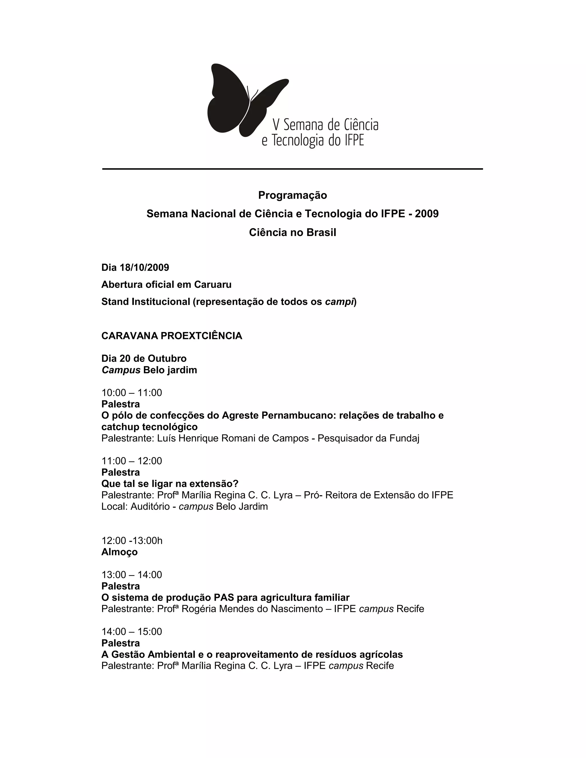 Este documento descreve a programação da Semana Nacional de Ciência e Tecnologia do IFPE em 2009, incluindo palestras, minicursos e atividades em diversos campi sobre temas como: