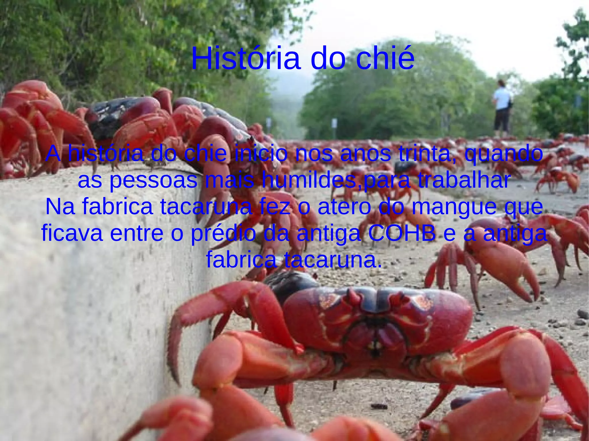 A história do bairro do Chié começou na década de 1930, quando pessoas humildes construíram barracos em um manguezal aterrado para ficarem mais próximas da fábrica Tacaruna e conseguirem empregos. O nome "Chié" vem de crustáceos e peixes encontrados no antigo manguezal. O aterro foi feito por pequenos barcos transportando lixo e serragem.