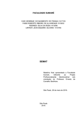 Este documento apresenta um relatório final de um projeto profissionalizante interdisciplinar realizado por alunos da Faculdade Sumaré sob orientação do Professor Ernesto de Carvalho Bedrikow. O relatório inclui a dedicatória, agradecimentos, resumo em português e inglês, lista de figuras e seções sobre introdução, SEMAT - Alphas Clientes, requisitos e sistema de software, responsabilidade e bibliografia.