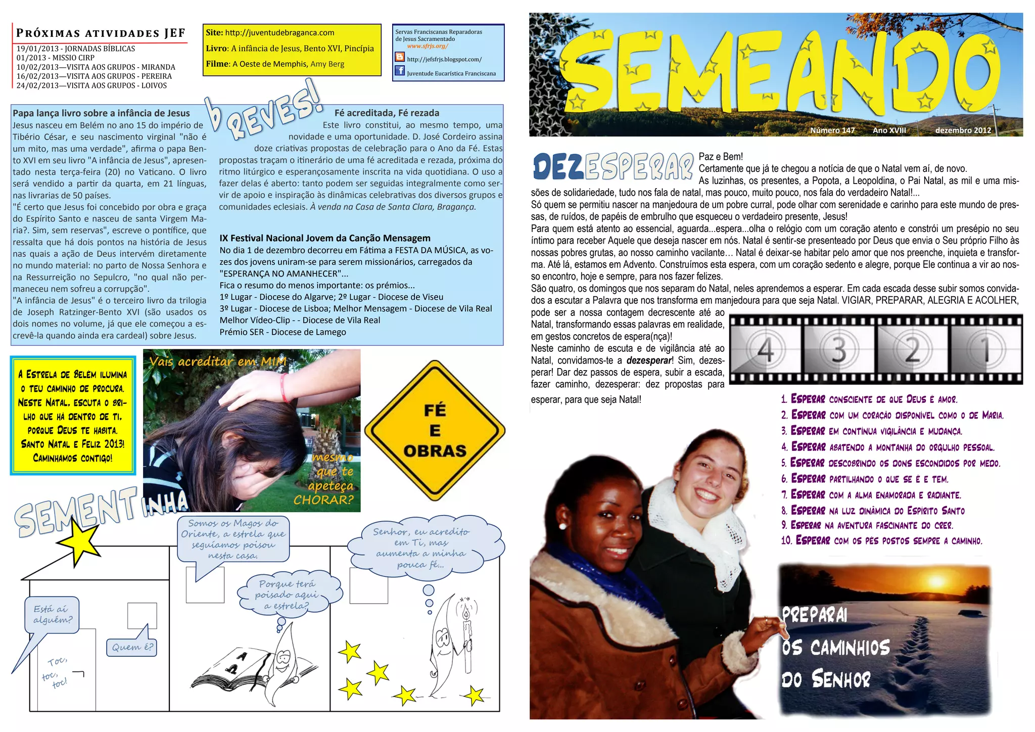 O documento resume as próximas atividades da Juventude Eucarística Franciscana, incluindo retiros bíblicos, visitas a grupos e o lançamento de um livro sobre a infância de Jesus pelo Papa Bento XVI. Também discute brevemente a fé de Maria e dos apóstolos.