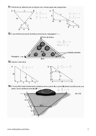 Os triângulos são semelhantes se os ângulos correspondentes forem iguais. Esta lista de exercícios sobre semelhança de triângulos contém 9 questões para identificar se triângulos dados são semelhantes analisando a igualdade de seus ângulos correspondentes.